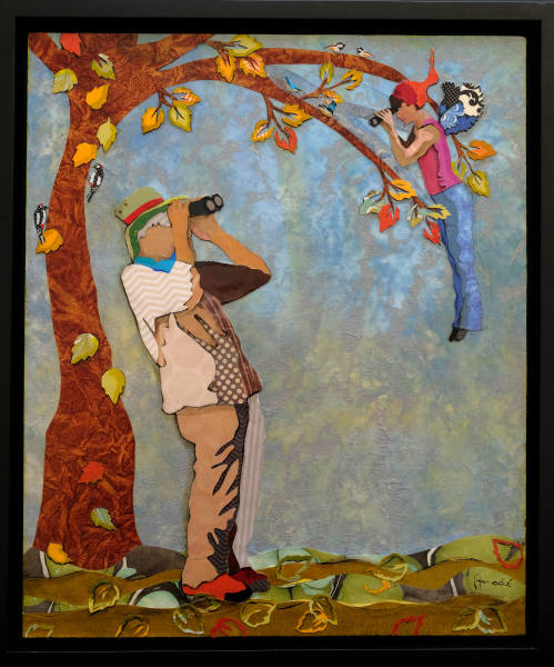 Birds - The prop of the binoculars was used by the characters to unite them in a common activity (bird watching) but also symbolized something they could never get past and actually see each other. That's why they are looking through the binoculars trying to find each other but can never quite make the connection and let down their guard (binoculars). The woman has wings like a bird because she was more free and was less bound overall by her own patterns, whereas the man is grounded, definitely fixed by his habitual ways of thinking and being.