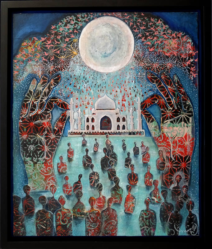 Taj - The people in the foreground are the workers who built the Taj. They are in the water which is the reflecting pool which is reflecting the moon. Water also being a symbol for cleansing. They are moving forward to transcend their cruel fate and you see them rising towards the moon. The moon is larger than the Taj referring to the lines in the play stating that the Taj is more beautiful than the moon and the response is that "No it's not." I agree on many levels in that the moon is enduring, benevolent, greater and more beautiful. The hands not only represent the amputated hands but they are in the mudra that represents Shiva who is both creator and destroyer.