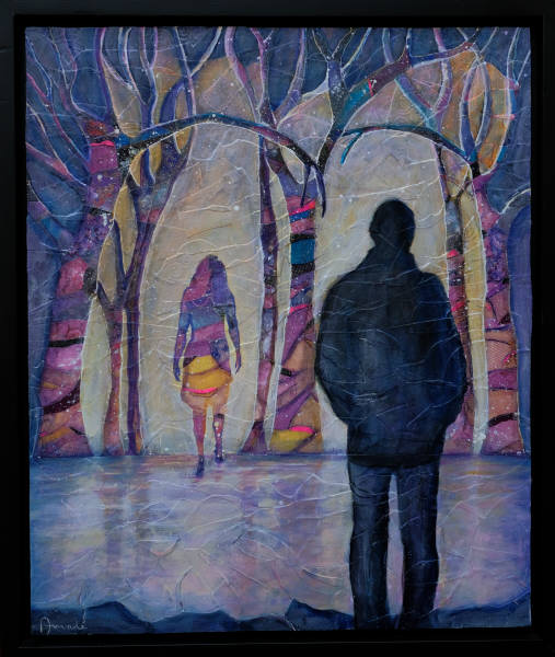 Going to a Place - The woman in the background is transitioning. She is planetary and also made of stardust. The trees symbolize the planetary. The planetary aspects, at death, are dissolving and she is becoming solely what she already is, the materials that make up the universe. The man is facing the same direction and is in shadow for he does not yet know what lies ahead. He can only watch unknowingly as the woman makes her journey, the same journey he will make soon.