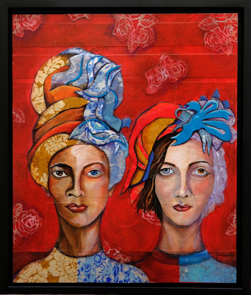 Marie Antoinette to not only be similar in dress with the tall head pieces but also in dignity and Motherhood. I found the younger woman could have become the older woman writer if she had lived and the elder writer could have been much like the younger woman in her youth. Hence the merging of the faces.